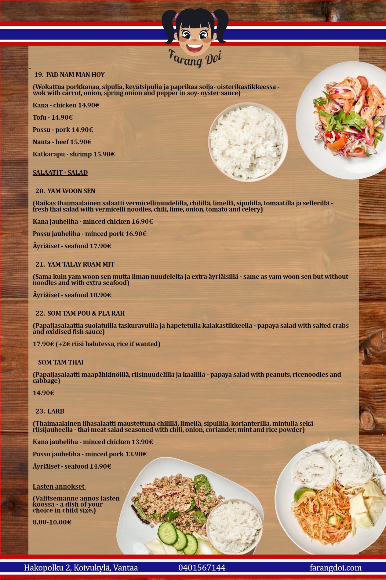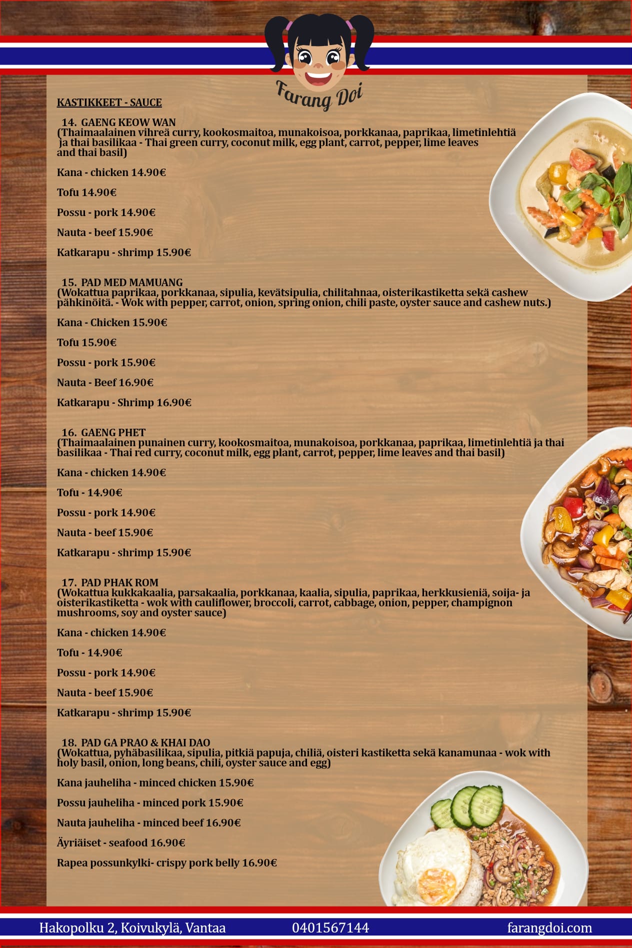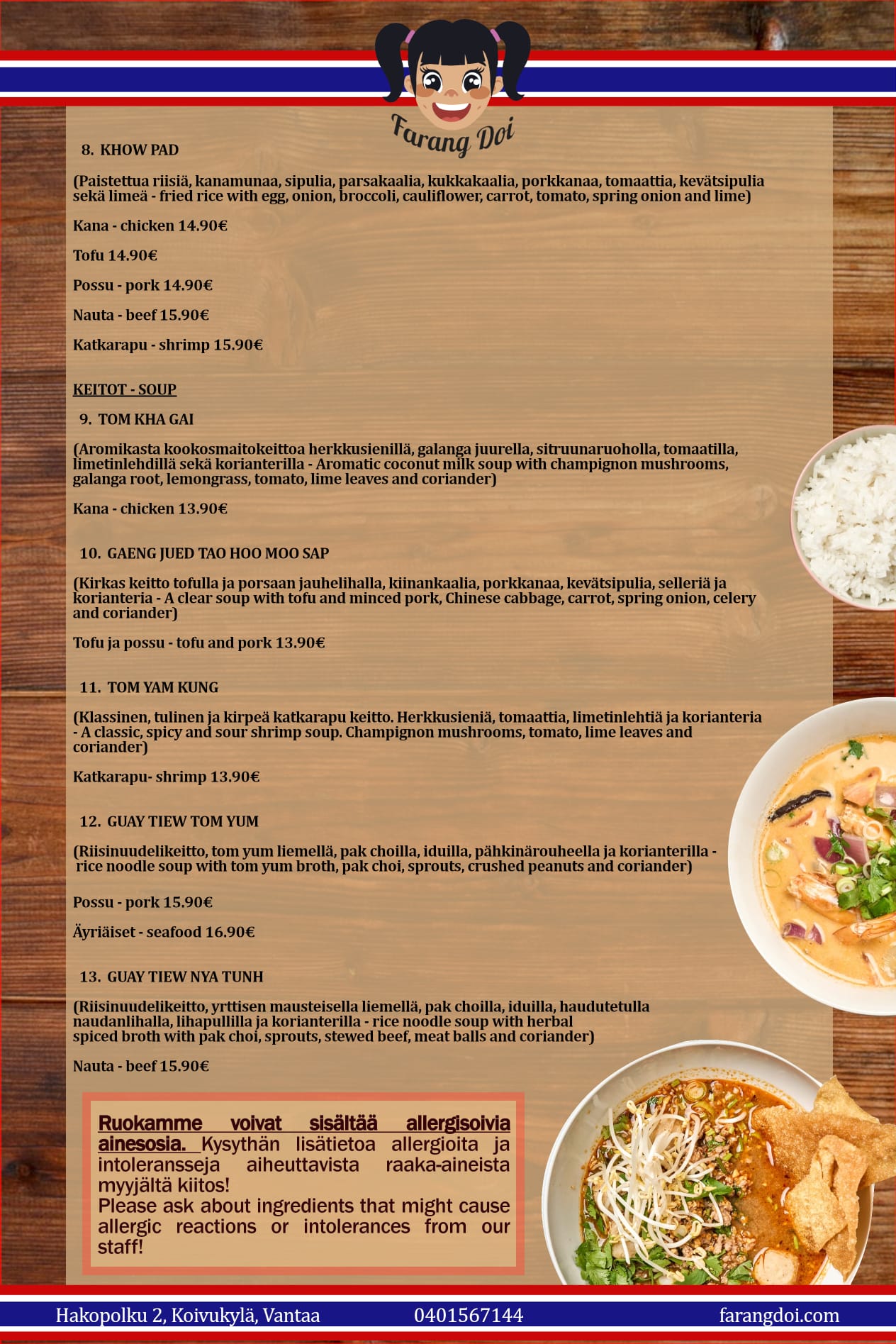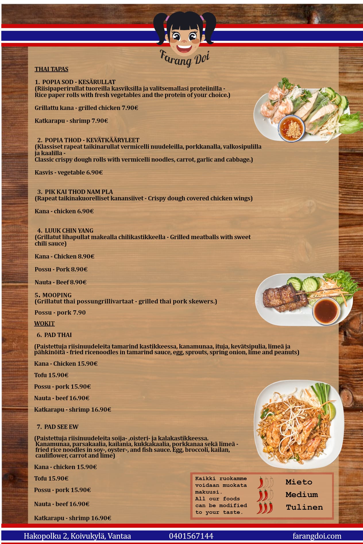 Farang Doi on perheomisteinen thaimaalainen ravintola, joka tarjoaa aitoja thaimaalaisia makuja ja ruokia. Olemme olleet toiminnassa jo vuodesta 2024 ja tuoneet thaimaalaisen keittiön herkut suomalaisten ulottuville